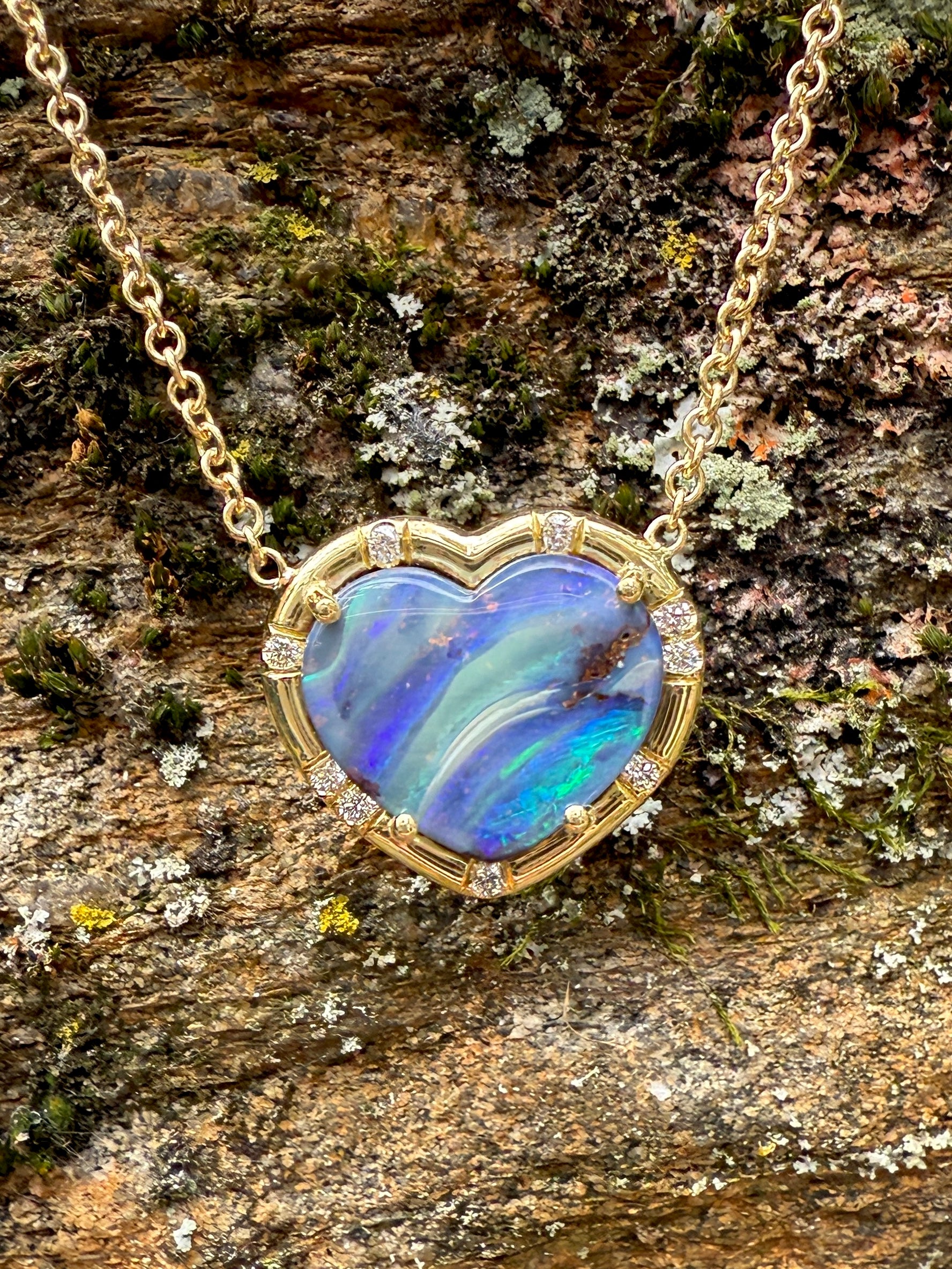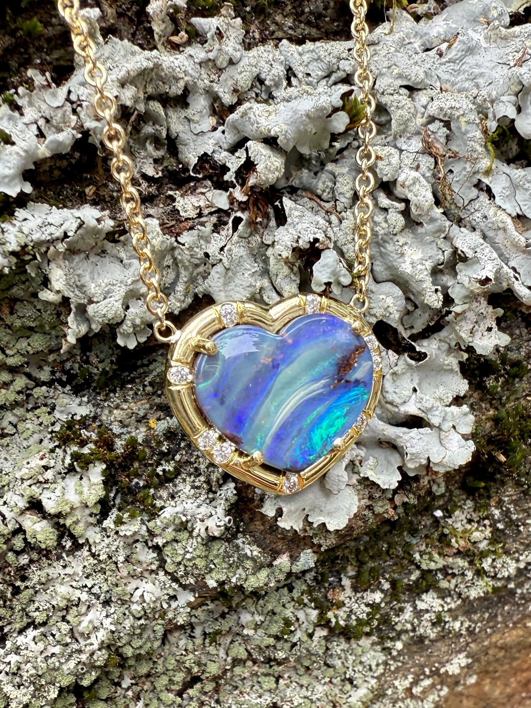 This 18k yellow gold necklace centers on a heart-shaped boulder opal, alive with vivid flashes of blue, green, white, and lavender, prong set to showcase its mesmerizing color and depth. The opal is set in our signature "Sprinkle" style, framed by an abstract arrangement of round brilliant-cut diamonds in gold, creating a sculptural halo that enhances its natural radiance. The pendant is suspended from a delicate cable chain accented with four bezel-set diamonds—two on each side—adding subtle sparkle and balance. Modern yet timeless, this necklace combines vibrant color, refined detail, and contemporary artistry for a truly captivating piece.