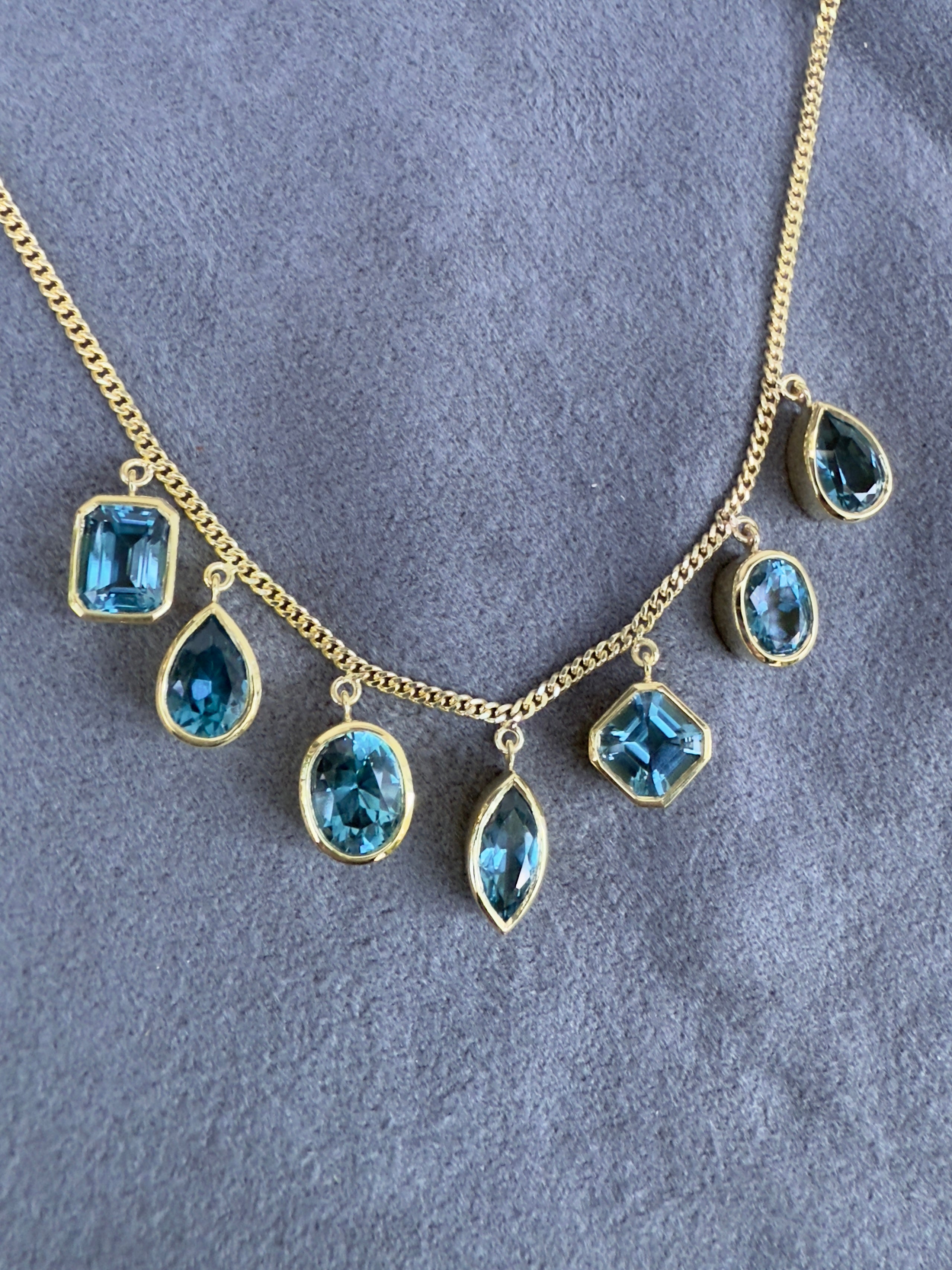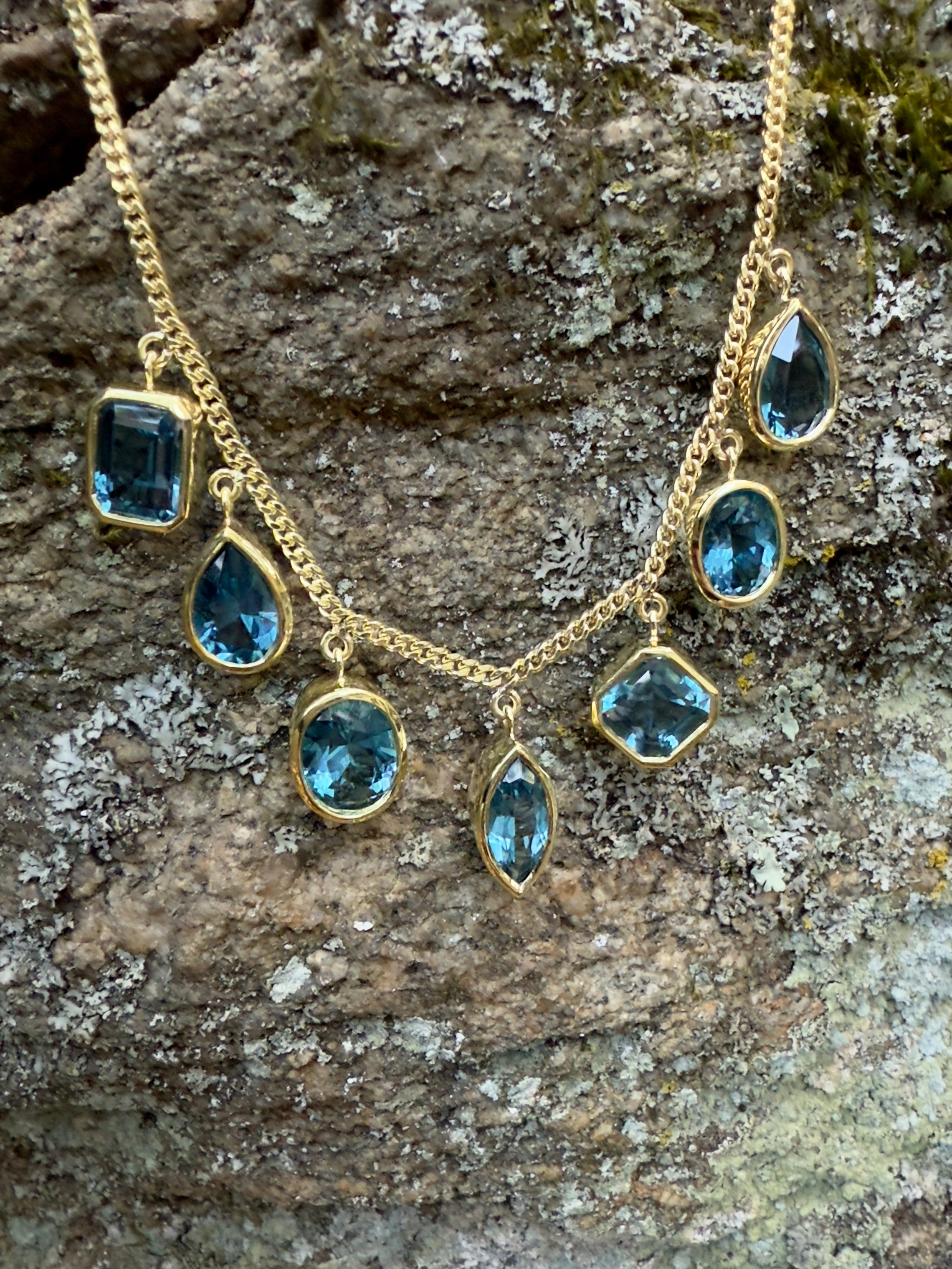 A modern ode to gemstone geometry, this 18k yellow gold necklace features seven London blue topaz in an artful mix of shapes—oval, round, pear, and emerald cut—each one bezel-set to showcase its deep, mesmerizing teal-blue tone. Arranged with a natural, fluid balance, the stones create a rich gradient of light and depth as they rest along the neckline. Suspended from a polished curb chain, the design offers both structure and ease, allowing the saturated color of the topaz to take center stage. Refined yet full of character, this piece delivers a sophisticated pop of color—equally striking worn solo or layered into your everyday rotation.