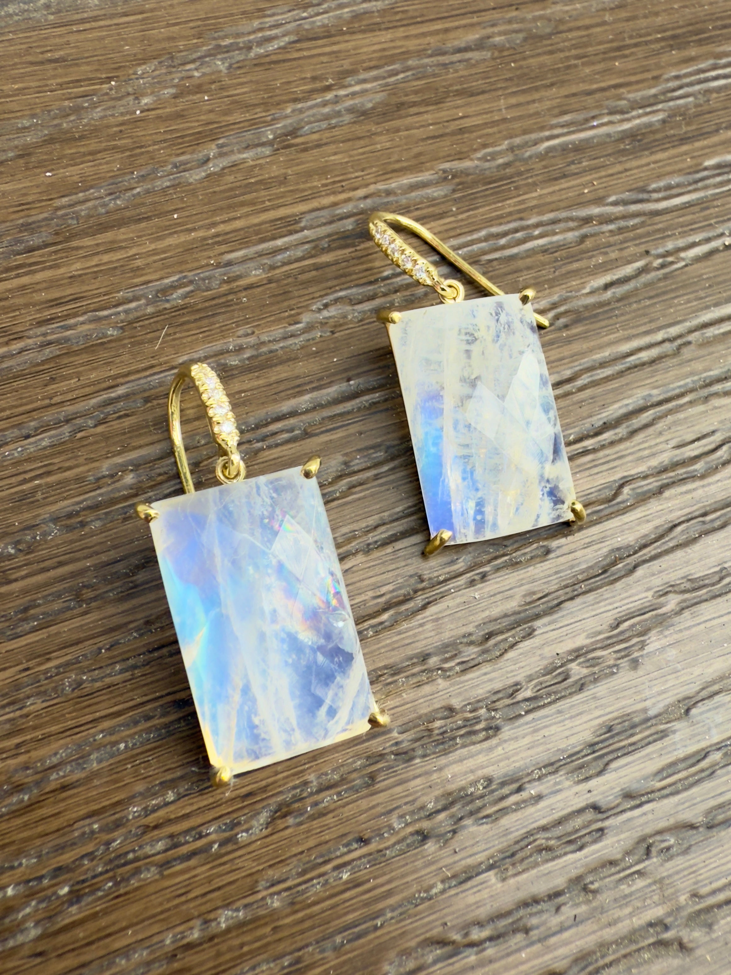 These 18k yellow gold earrings feature rectangular rainbow rose-cut moonstones, their soft, ethereal glow captured in delicate prong settings. Each stone is suspended from dainty ear wires adorned with micropavé-set diamonds, adding a subtle sparkle that enhances the moonstones’ luminous shimmer. The combination of clean geometric lines and gentle, celestial radiance creates a refined, modern design that is at once understated and captivating.