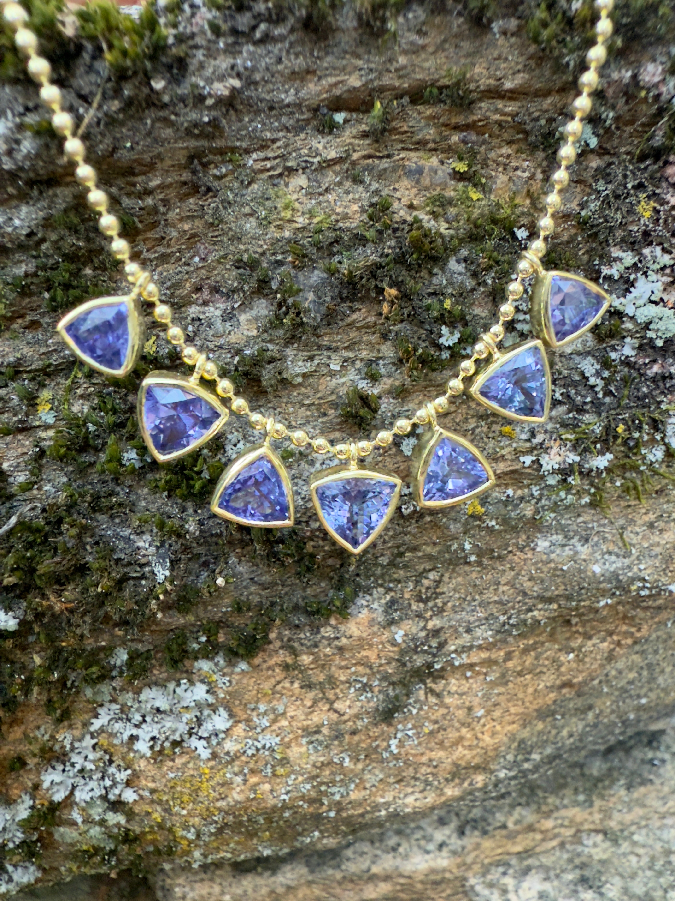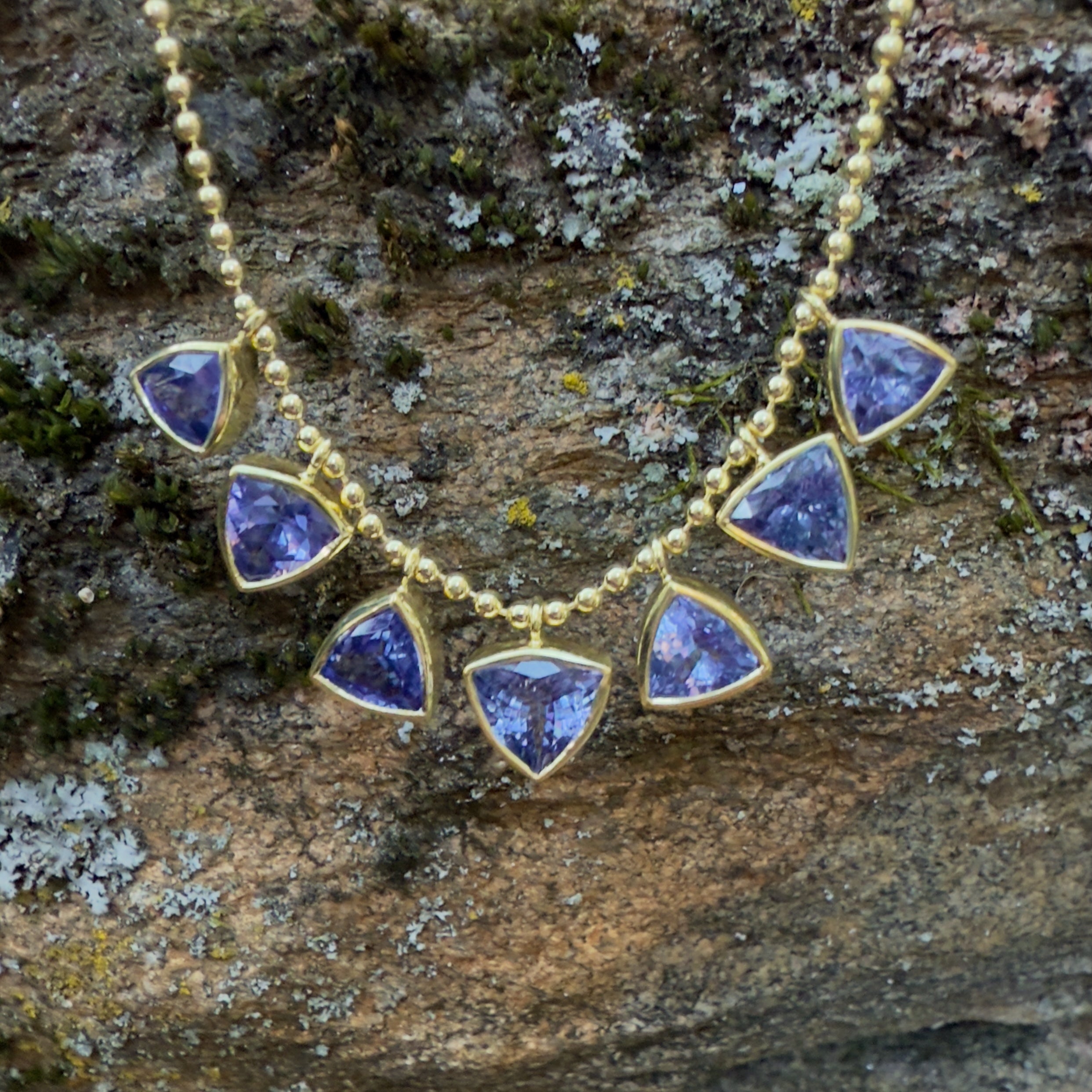 Crafted in luminous 18k yellow gold, this necklace showcases a captivating sequence of seven trillion-shaped tanzanites, each one bezel-set to highlight its vivid violet-blue fire. In a playful yet elegant rhythm, every other stone is inverted—one resting with its point upward, the next with its point downward—creating a subtle geometric dance along the neckline. The gems are suspended from a refined ball chain, allowing each tanzanite to sway gently and catch the light from every angle. Both modern and delicately feminine, this piece offers a fresh interpretation of symmetry, color, and form—perfect on its own or as a standout layer in a curated collection.