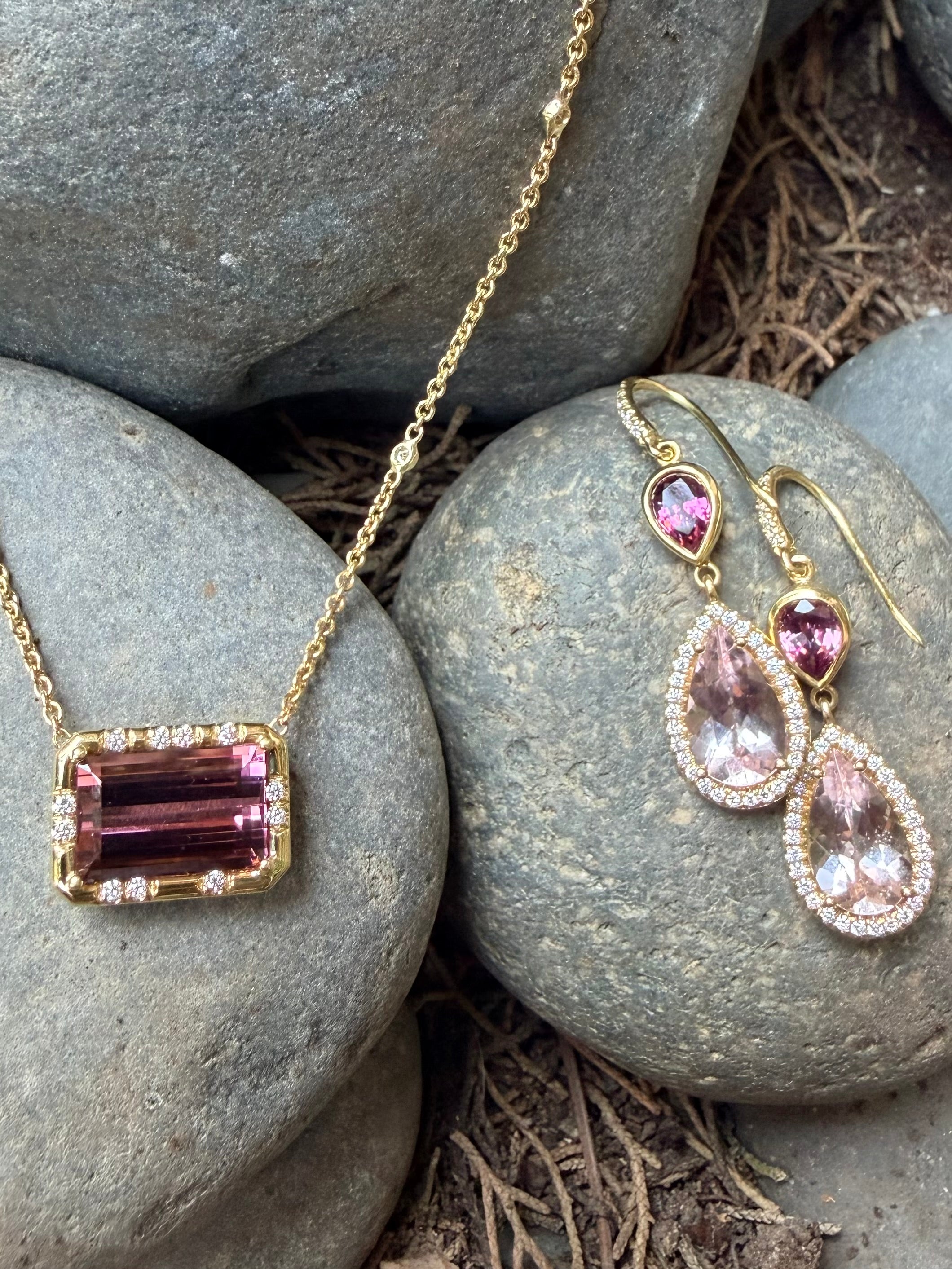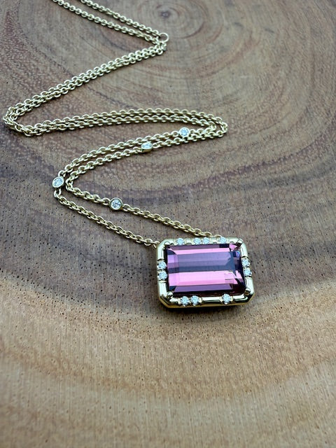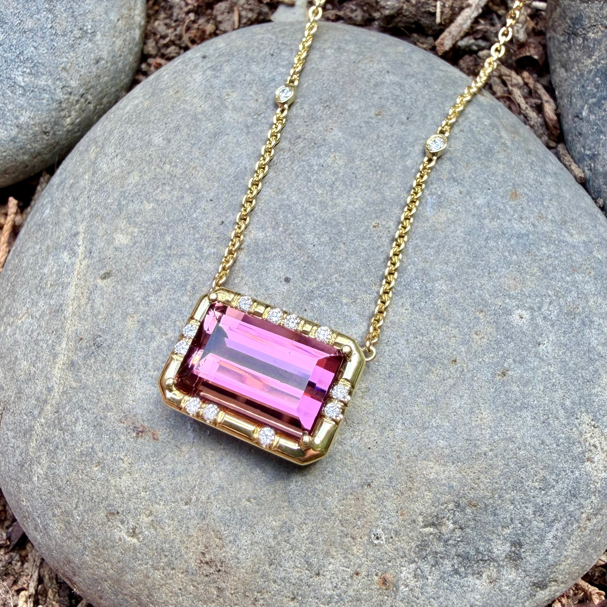 A vibrant emerald-cut pink tourmaline radiates from the center of this refined necklace, its saturated rose tones glowing through crisp, elongated facets. The gemstone is set in our signature "Sprinkle" design,  framed in warm gold and accented by abstract patterns of brilliant diamonds, creating a unique sparkle that highlights the tourmaline’s bold geometry. Suspended from a delicate cable chain, the design is further illuminated by four bezel-set diamonds spaced along the chain, adding subtle flashes of light that dance with every movement. Elegant yet distinctive, the piece balances vivid color with sculptural detail—a contemporary heirloom with effortless sophistication.