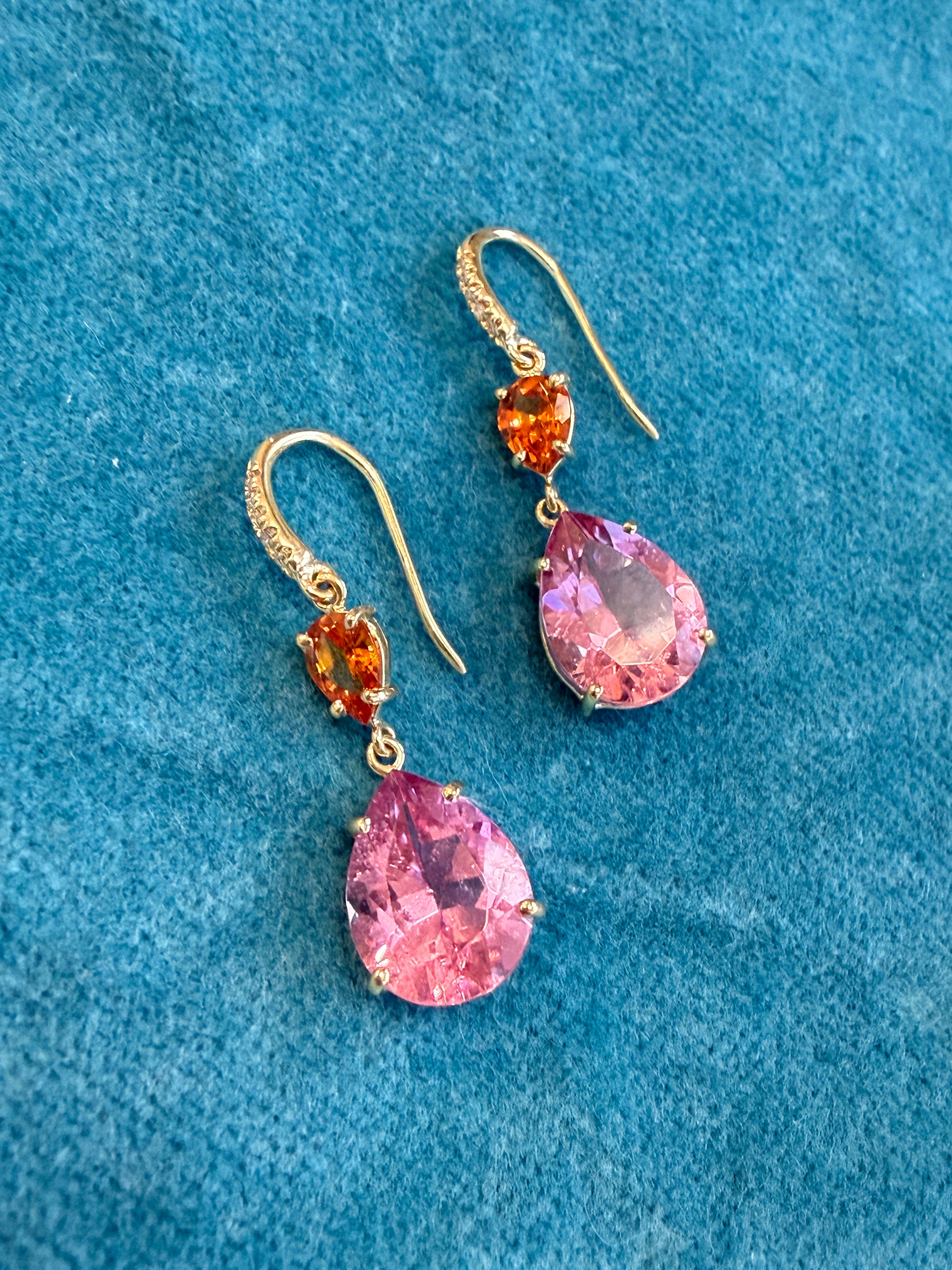 Vibrant and playfully refined, these earrings feature a captivating duet of prong-set pear-shaped gemstones: a smaller mandarin garnet paired with a larger pink tourmaline. Set with their points inverted to face one another, the design creates a striking sense of balance and visual conversation, highlighting the fiery orange glow of the garnet against the romantic blush of the tourmaline. Suspended from dainty micropavé-set diamond wires, the earrings offer graceful movement and a delicate shimmer, making them a distinctive yet elegant statement.