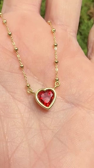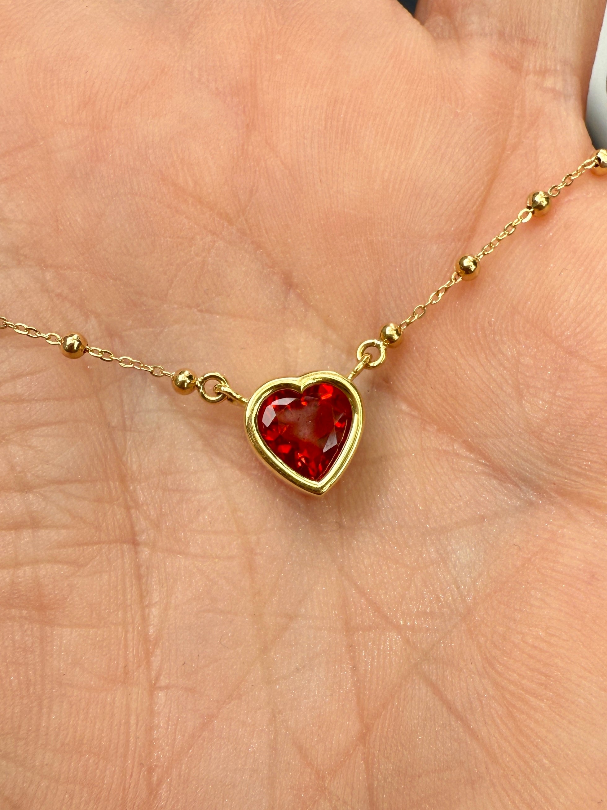 This 18k yellow gold necklace centers on a luminous heart-shaped fire opal, bezel set to showcase its radiant play of color. The glowing gem is suspended from a delicate chain composed of fine links interspersed with tiny polished gold beads, adding subtle texture and movement. Romantic and refined, the design highlights the opal’s inner fire while exuding a soft, timeless elegance.