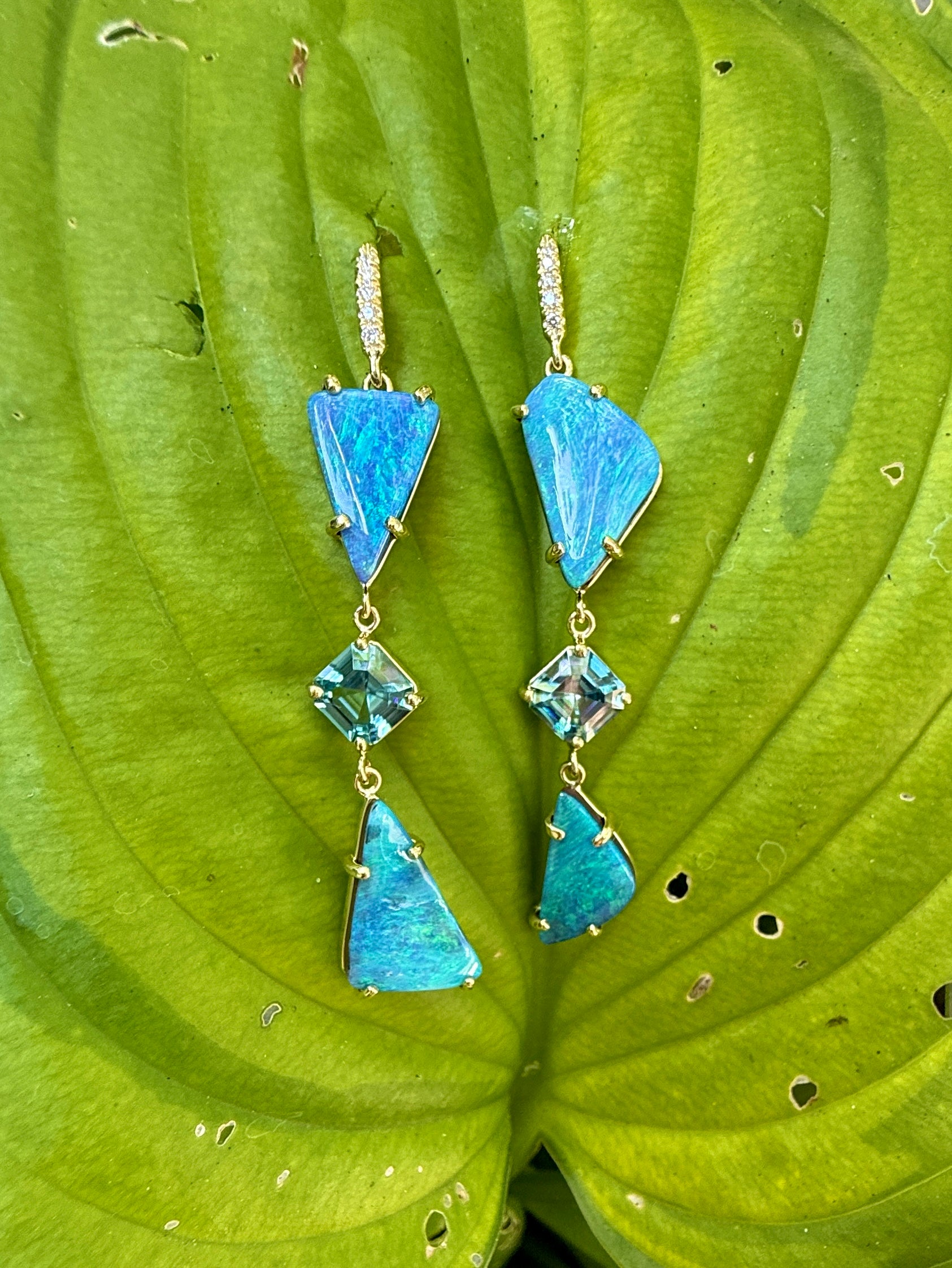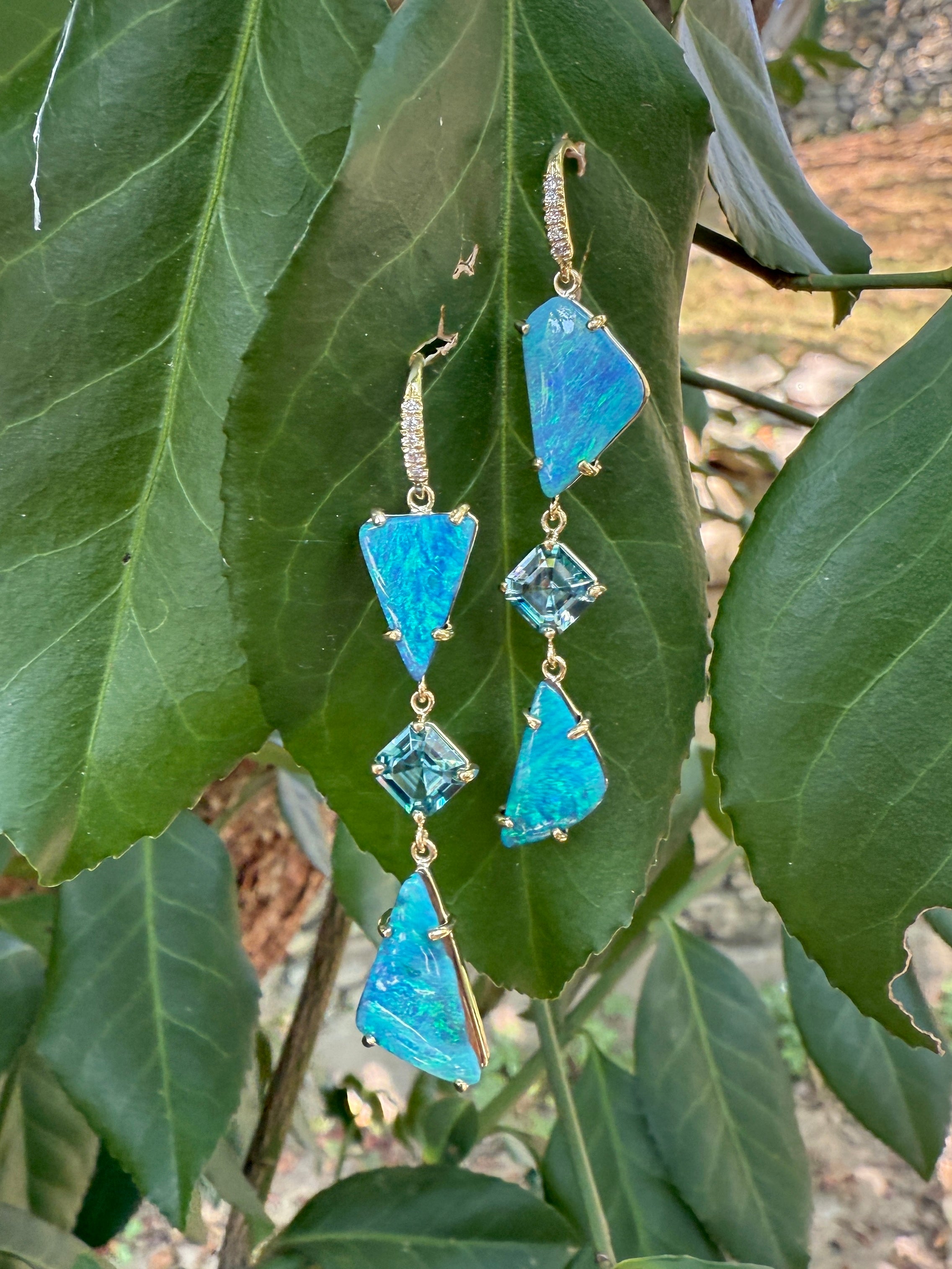 These striking 18k yellow gold earrings celebrate color and movement with free-form, vividly iridescent Australian boulder opals whose shifting flashes of green, blue, and fire seem to hold a world within. Between them, square-cut blue zircons are set on their sides like little turning windows of sky, creating a bold geometric contrast to the opals’ organic shapes. All stones are prong-set to let the light flow through freely, and they sway gently from dainty diamond-lined wires, scattering a trail of sparkle with every motion.