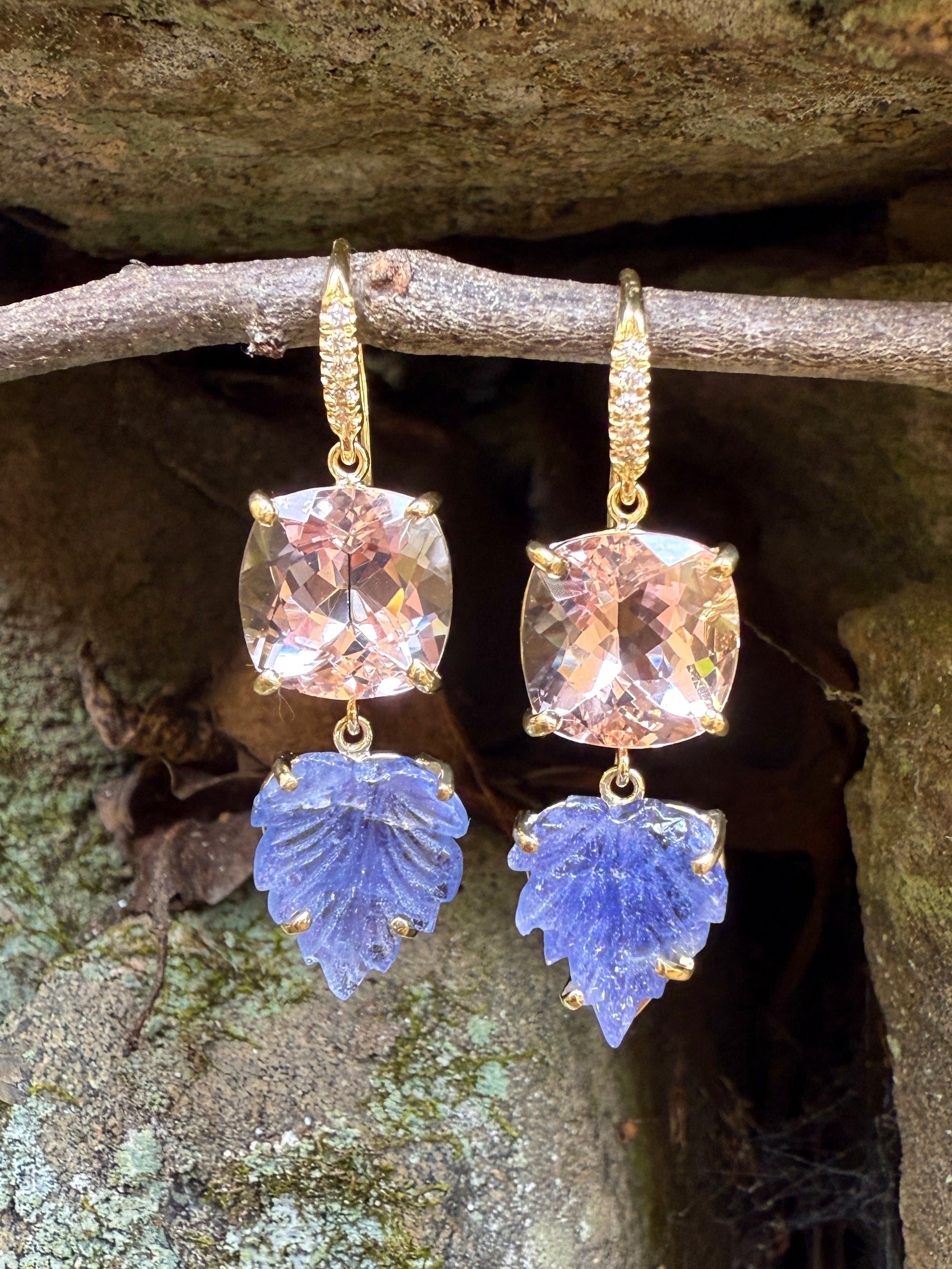 These 18k yellow gold earrings pair the soft, romantic glow of cushion-cut morganites with the whimsical charm of carved tanzanite leaves that dangle beneath. Each morganite is prong-set to catch the light from every angle, while the delicate tanzanite leaves add movement and a touch of natural elegance. Suspended from dainty micropavé diamond-lined wires, the earrings shimmer gently, creating a graceful interplay of color, light, and form—a harmonious dance of springtime hues in gold.