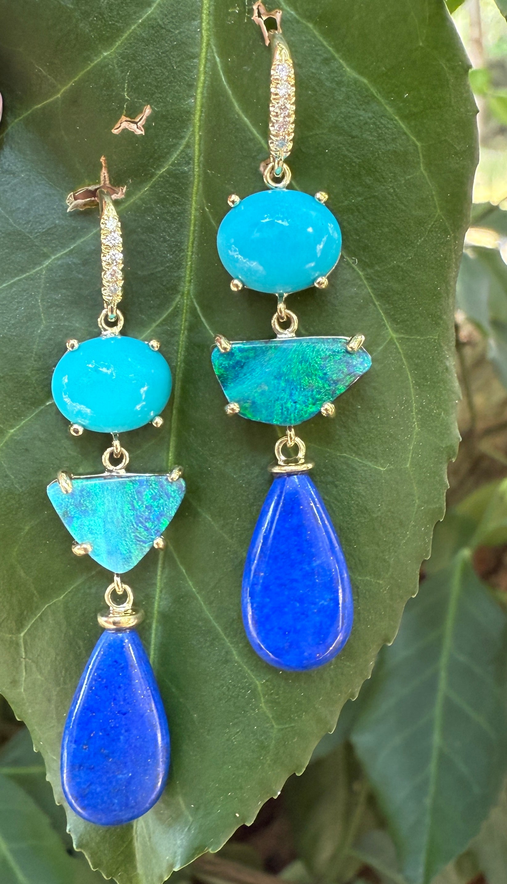 These enchanting 18k yellow gold earrings weave together three shades of blue in a cascading composition. At the top rests a smooth oval of Sleeping Beauty turquoise, serene and luminous like a summer sky. Below, a freeform natural boulder opal shimmers with shifting color, its prong-set surface alive with fire and mystery. Finishing the design, a deep lapis briolette sways beneath like a drop of midnight. Each element is suspended from dainty micropavé diamond-set wires, so the earrings sparkle and dance with every movement—a little constellation of blues captured in gold.
